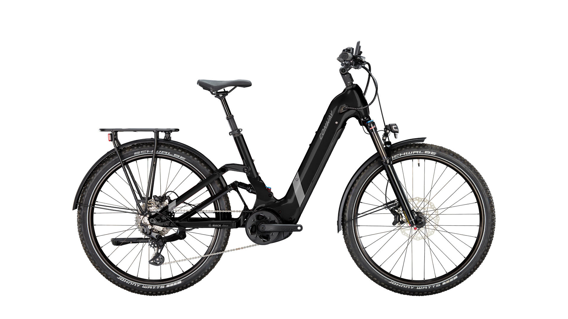 Voll vernetzt in jedem Gelände: Conway hat sein Cairon SUV FS 5.7 von oben bis unten mit dem Bosch Smart System ausgerüstet. Alle Komponenten können jetzt miteinander kommunizieren, dich mit Toureninformationen versorgen und sie sind einfach konfigurierbar. Der technische Clou des Cairon SUV FS 5.7 ist der Rahmen, der trotz des tiefen und komfortablen Einstiegs voll gefedert ist, also neben der Federgabel auch mit einem Dämpfer ausgerüstet ist, der den Hinterbau komplett abstützt. Damit gibt’s noch mehr Komfort auf unebenen Wegen und im Wald. Die 60 mm breiten Schwalbe Johnny Watts Reifen bieten mit ihrem Profil leichten Lauf auf hartem Untergrund und sind gleichzeitig leise, wenn es über Asphalt geht. Letztendlich überzeugt er mit hohem Pannenschutz in jedem Terrain - ein verlässlicher Reifen für alle Wege. Zu den vier Unterstützungsstufen des Bosch Performance CX Mittelmotors kommt die 12-fach Sram SX Kettenschaltung hinzu, womit sich jederzeit die gewünschte Trittfrequenz einstellen lässt. Mit ihren vier Kolben lassen sich die starken Kräfte der Tektro Bremsen feinfühlig einteilen. Schließlich ist das Cairon SUV FS 5.7 ein komfortabler und sportlicher Allrounder, mit dem es sich auch da sicher fahren lässt, wo die Straße aufhört. Im Stadtverkehr erhöht die LED-Lichtanlage deine Sicherheit. Der Scheinwerfer strahlt mit taghellen 80 Lux den Weg sicher aus. Das Rücklicht überzeugt mit seiner Stopplichtfunktion.