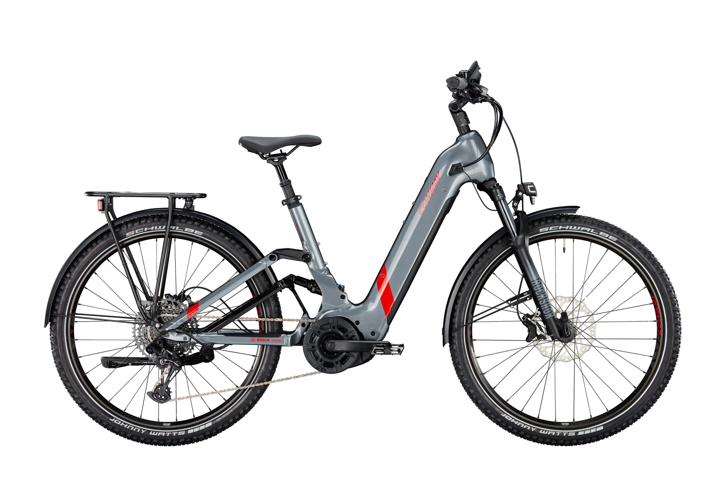 Voll vernetzt in jedem Gelände: Conway hat sein Cairon SUV FS 5.7 von oben bis unten mit dem Bosch Smart System ausgerüstet. Alle Komponenten können jetzt miteinander kommunizieren, dich mit Toureninformationen versorgen und sie sind einfach konfigurierbar. Der technische Clou des Cairon SUV FS 5.7 ist der Rahmen, der trotz des tiefen und komfortablen Einstiegs voll gefedert ist, also neben der Federgabel auch mit einem Dämpfer ausgerüstet ist, der den Hinterbau komplett abstützt. Damit gibt’s noch mehr Komfort auf unebenen Wegen und im Wald. Die 60 mm breiten Schwalbe Johnny Watts Reifen bieten mit ihrem Profil leichten Lauf auf hartem Untergrund und sind gleichzeitig leise, wenn es über Asphalt geht. Letztendlich überzeugt er mit hohem Pannenschutz in jedem Terrain - ein verlässlicher Reifen für alle Wege. Zu den vier Unterstützungsstufen des Bosch Performance CX Mittelmotors kommt die 12-fach Sram SX Kettenschaltung hinzu, womit sich jederzeit die gewünschte Trittfrequenz einstellen lässt. Mit ihren vier Kolben lassen sich die starken Kräfte der Tektro Bremsen feinfühlig einteilen. Schließlich ist das Cairon SUV FS 5.7 ein komfortabler und sportlicher Allrounder, mit dem es sich auch da sicher fahren lässt, wo die Straße aufhört. Im Stadtverkehr erhöht die LED-Lichtanlage deine Sicherheit. Der Scheinwerfer strahlt mit taghellen 80 Lux den Weg sicher aus. Das Rücklicht überzeugt mit seiner Stopplichtfunktion.