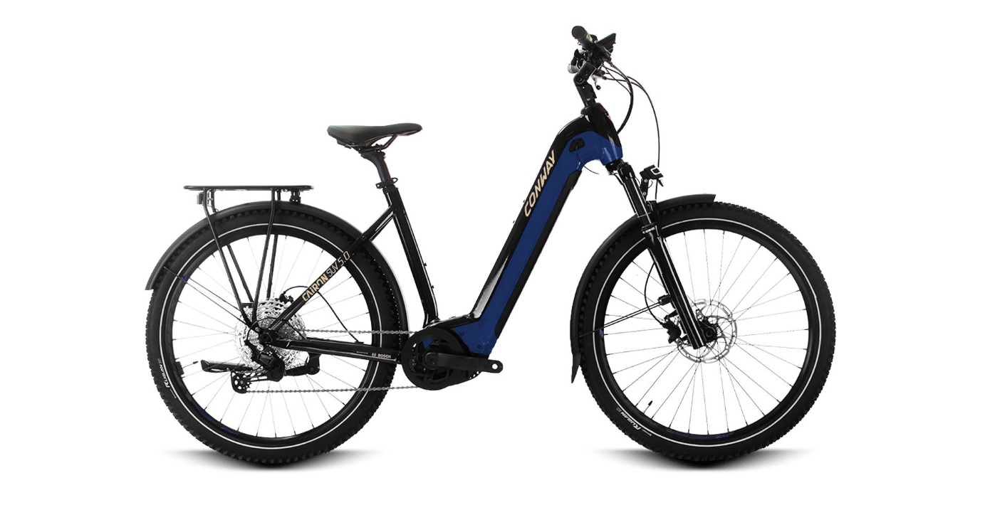 Die SUVs von Conway vereinen Geländegängigkeit und beste Kontrolle mit aufregendem Fahren und Komfort. Für noch mehr Fahrspaß haben die Entwickler das Cairon SUV 5.0 mit einem stärkeren Motor sowie dem reichweitenstärksten Bosch PowerTube Akku, der vollständig im Rahmen integriert ist, aufgewertet. Mit den vier Unterstützungsstufen des kräftigen Bosch Performance CX Motors und den 11 Gängen der Shimano Deore Kettenschaltung lässt sich die Unterstützung bis 25 km/h einfach einteilen. Der 750-Wh-Akku lässt sich zum Laden entweder nach unten hin entnehmen oder du lässt ihn einfach im Rahmen und lädst ihn über die Ladebuchse an der linken Seite des Rahmens. Um unterwegs auch auf unbefestigten Wegen beste Performance und hohen Komfort zu genießen, sind die 58 mm breiten Continental-Reifen fein profiliert und dämpfen gemeinsam mit der 120 mm Federgabel von Suntour auch den Untergrund von Feld- und Waldwegen wie Kopfsteinpflaster gut ein. Für die notwendige Sicherheit sowohl bei schnellen Bergab-Fahrten als auch im Stadtverkehr ist die hydraulische Scheibenbremse von Tektro da (Scheibendurchmesser vorne und hinten: 180 mm). Die Bremskraft lässt sich fein dosieren, doch lässt sie dich nicht im Stich, wenn es mal spontan drauf ankommt. Dank Schutzblechen und Licht-Anlage kann jede Tour bei jedem Wetter mit dem Cairon SUV 5.0 bis in die späten Abendstunden verlängert werden.