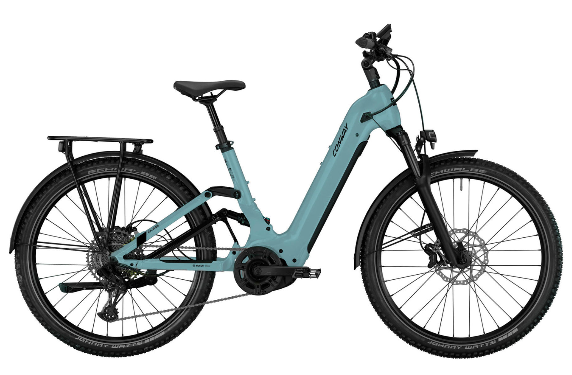 Die Federung umfasst einen Gabelfederweg von 120 mm und einen Rahmenfederweg von 100mm, was eine angenehme Fahrt auf unterschiedlichsten Untergründen ermöglicht. Die Ausstattung beinhaltet Schutzbleche und ist für ein zulässiges Gesamtgewicht von 140kg ausgelegt. Durch den raffiniert angelenkten Hinterbau weicht das Rad und der Gepäckträger direkt nach oben aus, somit wird die Ladung nicht in Richtung Sattel und Fahrer gedrückt.