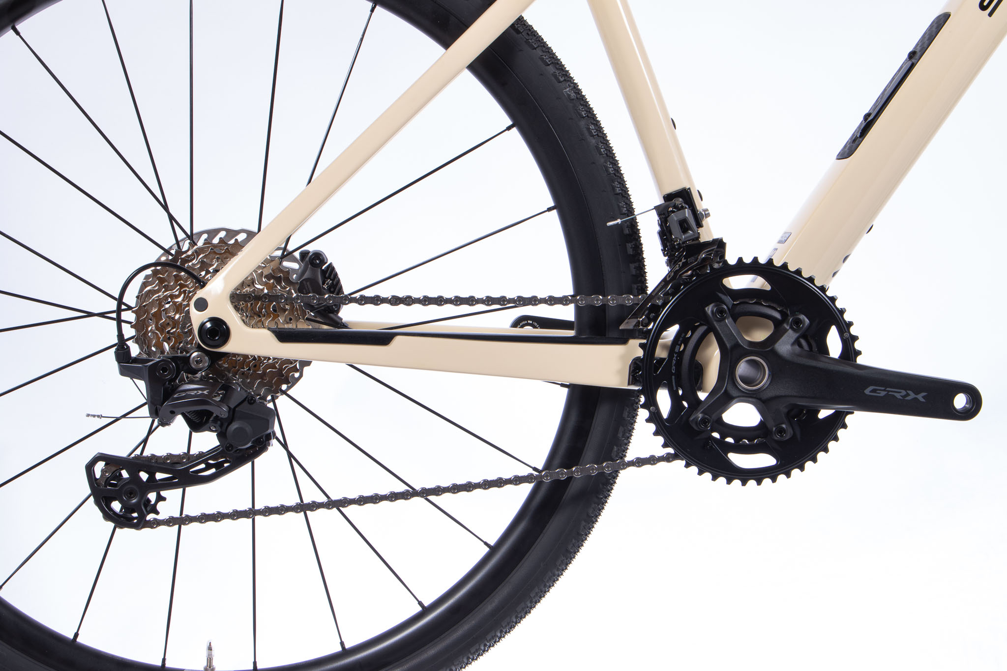 - Reifenfreiheit bis 45 mm – serienmäßig mit 40 mm Gravelreifen, optional bis 45 mm für mehr Grip und Komfort auf Schotter oder Trail