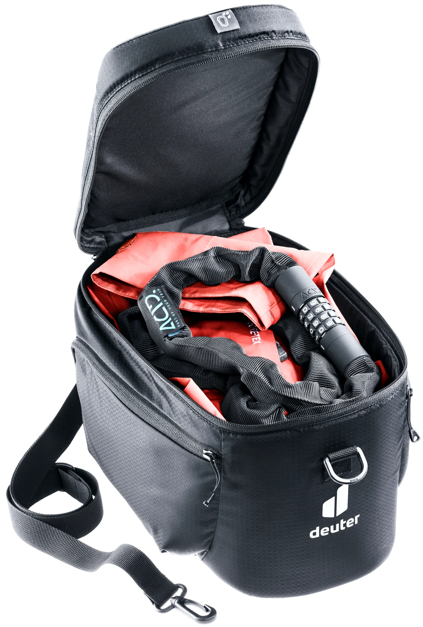 Eine abnehmbare Regenhülle schütz den Inhalt zuverlässig vor Nässe und der abnehmbare Schultergurt ermöglicht das bequeme Schultern der Tasche.
